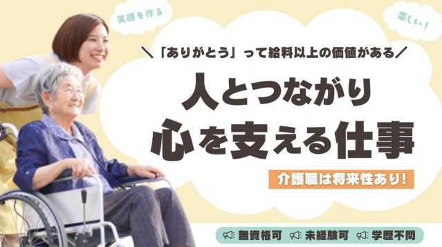 特別養護老人ホームに入所されている、常時介護を必要とする高年齢者の食事、入浴、排泄、食事等日常生活の介護業務を担当していただきます